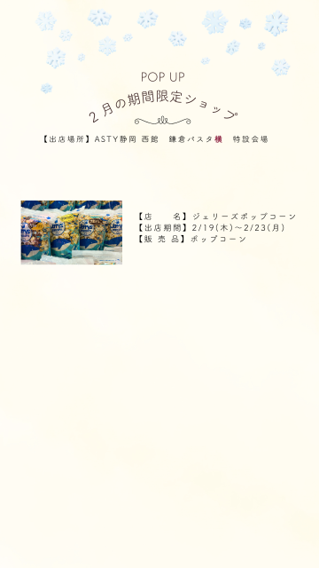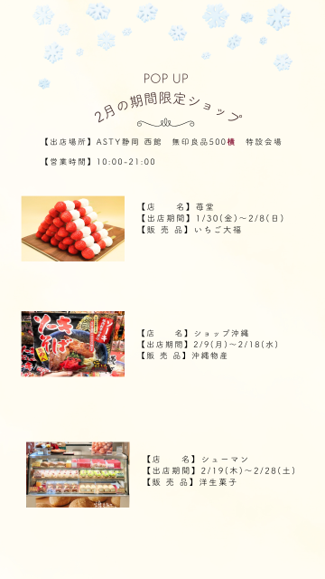 2月の期間限定ショップをご案内いたします。 詳細は下記をご覧ください。 皆様のお越しをお待ちしております。 ♦営業時間:10:00~21:00 ♦開催場所:無印良品500 横 ♦開催場所:鎌倉パスタ 横