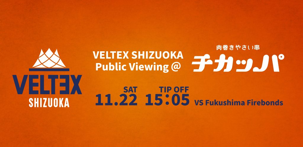 ベルテックス静岡ブースターの皆様 きたる11/22(土)、アスティ静岡内の「肉巻きやさい串 チカッパ」にて vs福島ファイヤーボンズ戦のパブリックビューイングを開催いたします! 「応援の熱狂をブースター同士分かち合いながら応援したい!けど会場には行けない、、」 こんなジレンマを解決!JR静岡駅直結のアスティ静岡で、おいしい料理とドリンクを片手に 熱く楽しくベルテックス静岡を応援しましょう! また、当日ゲストとしてフロントスタッフの方にお越しいただきます! チームのリアルを知るスタッフの解説は必見です! 参戦を希望される方は、以下概要と注意事項をご確認の上、 〆切までに店舗への予約(電話)をお願いいたします。