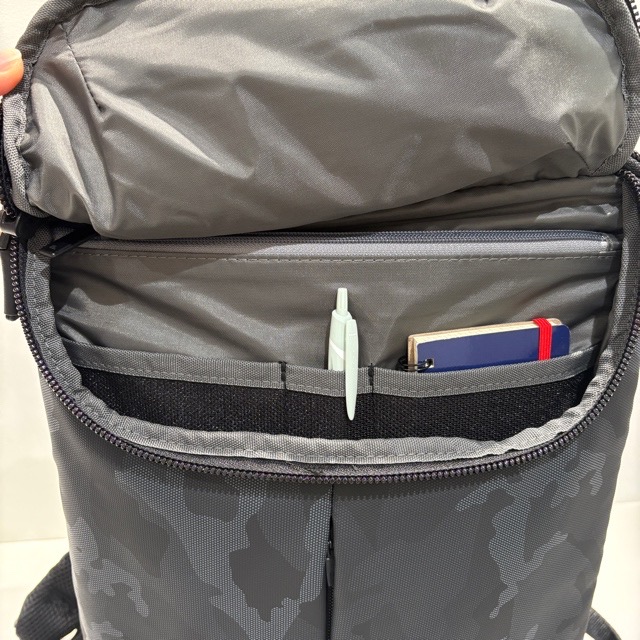 正面のポケットにはペンやメモ帳、定期券など