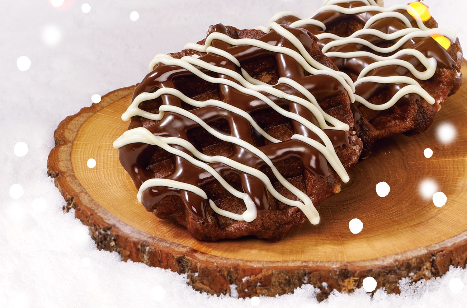 2025/12/1~2025/12/31 [12月新商品] ショコラマーブル 税込240円 ベルギーチョコチップが溶け込んだ生地に、ほんのりビターなチョコレートとミルク風味豊かなホワイトチョコレートコーチングで華やかに仕上げたワッフルです。