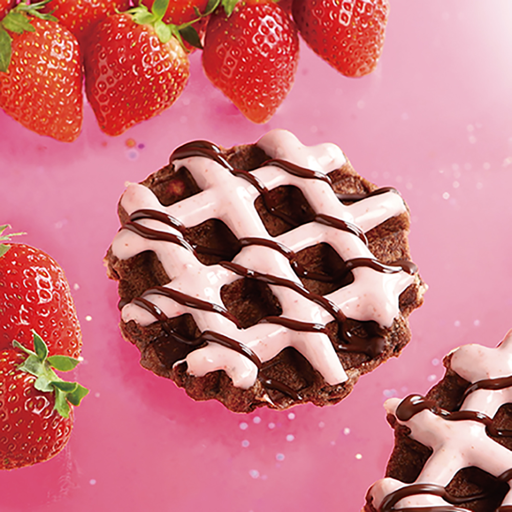 2026/2/1~2026/2/28 [2月新商品] ストロベリーショコラ 税込250円 深みのあるチョコレート風味の生地に、ドライのいちごと甘酸っぱいクランベリーを練り込みました。 フリーズドライのいちごの果肉が入ったストロベリーチョココーチングと、ほんのりビターなチョコレートで華やかな見た目に仕上げたワッフルです。