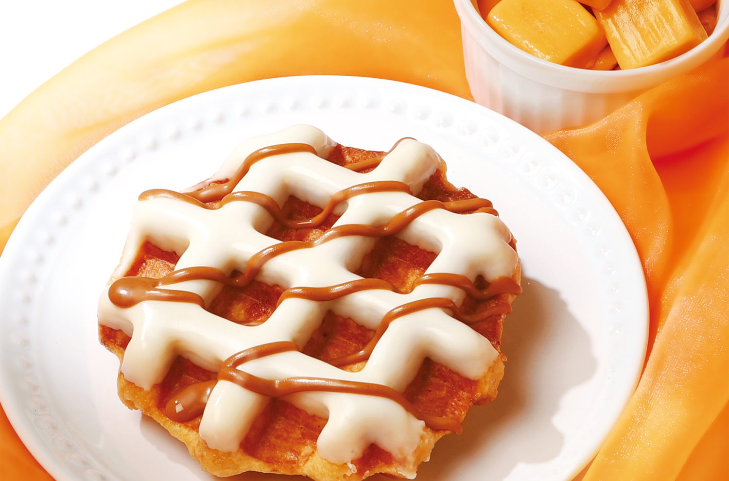 2026/3/1~2026/3/31 [3月新商品] キャラメルミルク 税込240円 生地にはほんのりビターなキャラメルソースとキャラメルパウダーを練り込み、風味のアクセントにほろ苦いカラメルチップを加え焼き上げました。 さらに豊かなミルクのコクと甘さが感じられるホワイトチョコレートコーチングを格子につけ、ミルクキャラメルチョコレートコーチングで華やかに仕上げたワッフルです。