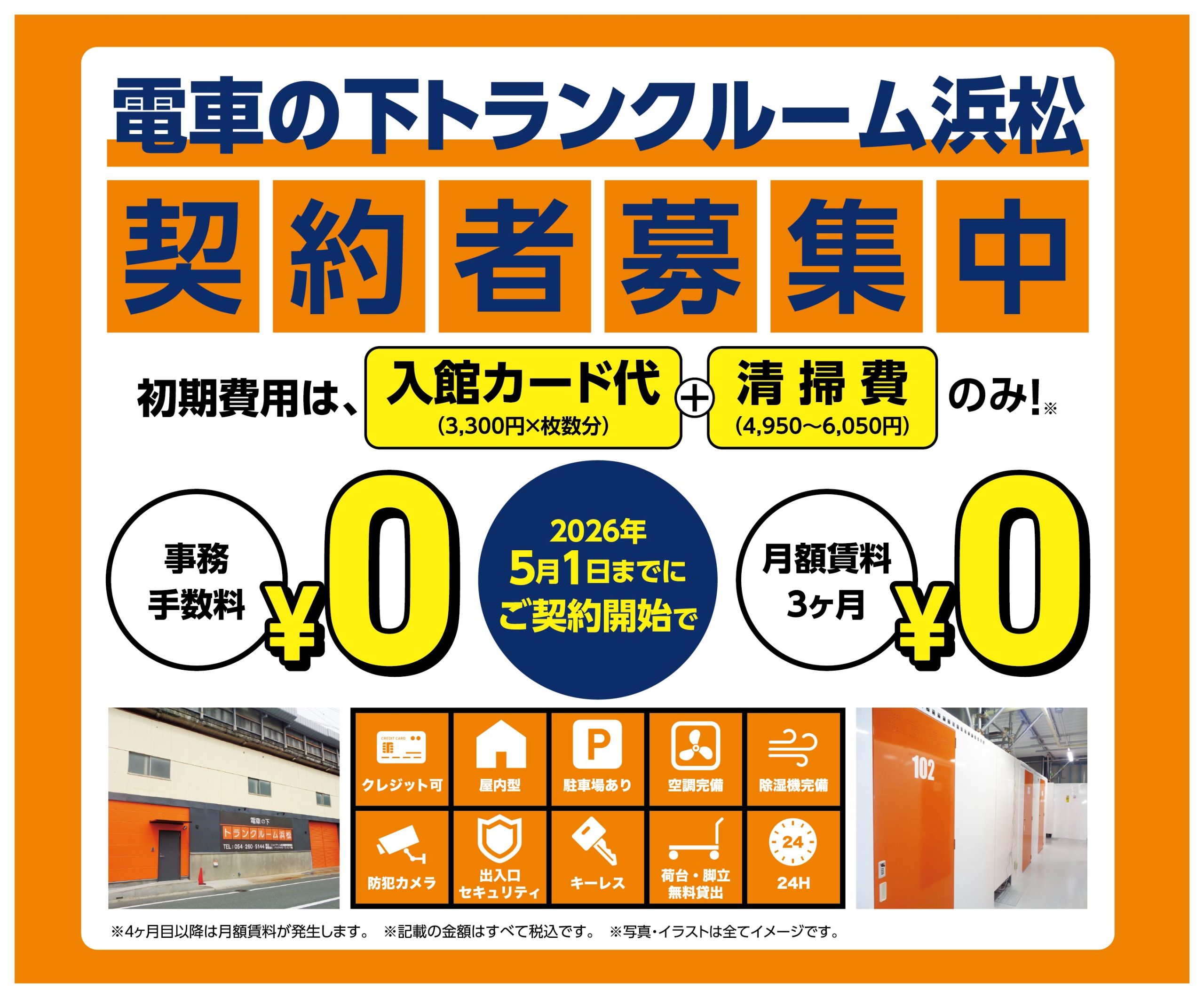 平素より、弊社物件をご利用いただき、誠にありがとうございます。今回は、日ごろご愛顧いただいております浜松エリアの月極駐車場のご契約者様限定で電車の下トランクルーム浜松がお得に契約できるキャンペーンを開始いたします。この機会に、ぜひご検討ください。 電車の下トランクルーム浜松 詳細はこちら
